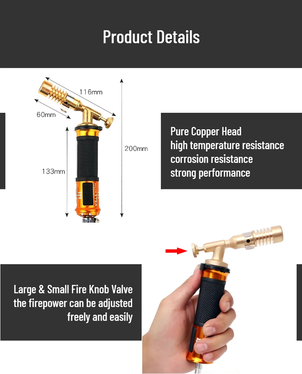 Applicable Scenarios: Metal Welding, Pipe Thawing, Outdoor Barbecue, Cake Baking, Air Conditioner Refrigerator Copper Pipe Processing, Butcher Shop (Singeing), Household Maintenance