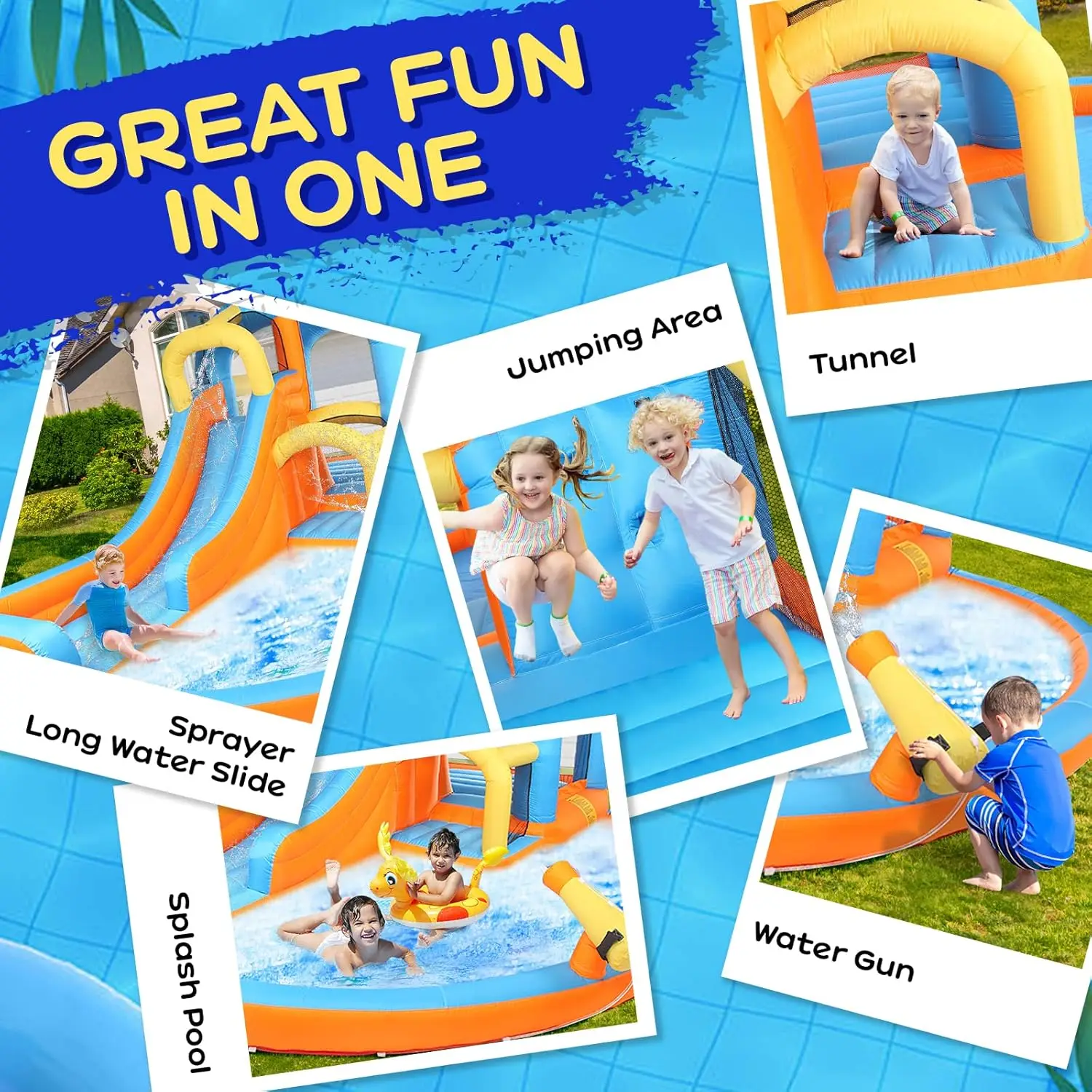 5-in-1 Inflatable Water Slide Park, Water Bounce House w/Air Blower, Climbing Wall, Double Jump Area, Splash Pool, Water Cannon, Wet or Dry Combo Castle Outdoor Backyard Playhouse for Kids