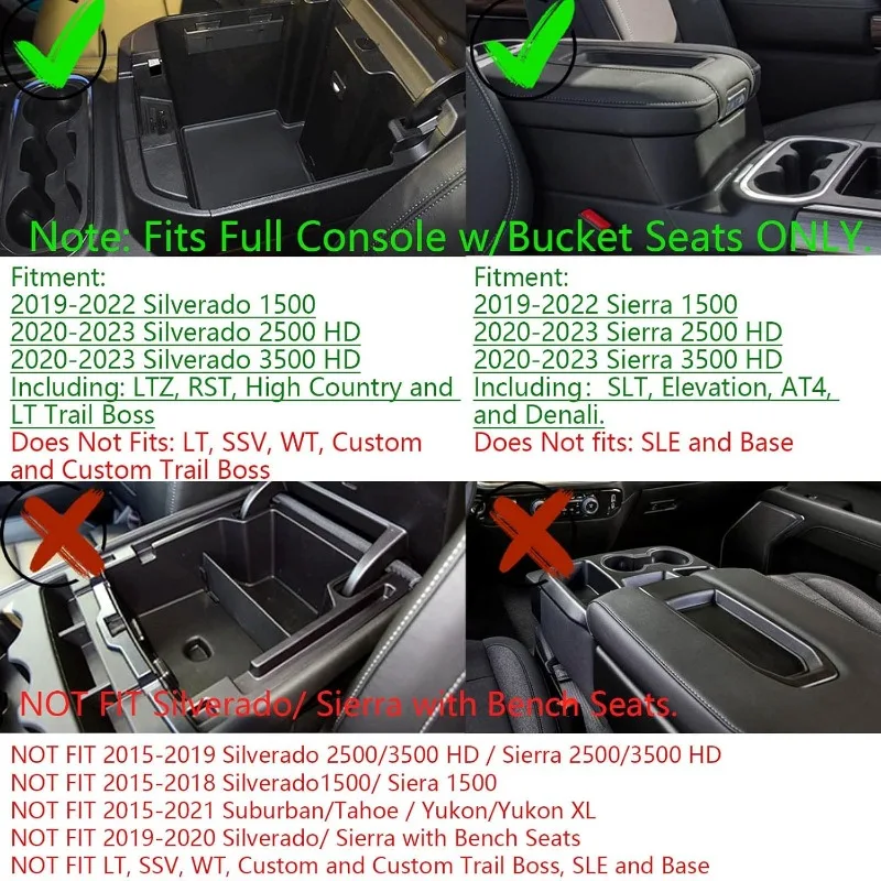 "Fitment: The Console Tray Compatible with 2019 2020 2021 2022 Silverado 1500/Sierra 1500, and 2020 2021 2022 2023 Silverado/ Sierra 2500 HD/3500 HD including LT, LTZ, Trail Boss, RST, and High Country, also including SLE, SLT, Elevation, AT4, and Denali. (Full console w/bucket seats ONLY!), NOT FOR Split Bench Seats.