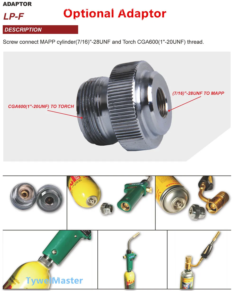 We also provide a CGA600 to 7/16"-28UNF adaptor for option, which can be used with ROTHENBERGER style MAPP cylinder, if you need this adaptor please get it from below link: Adaptor-CGA600-to-7-16-28UNF.